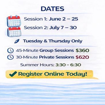 To secure your child’s spot, please pay the nonrefundable deposit of $100 here. This deposit will be credited toward your final invoice. The remaining balance for June and July sessions is due on May 3, 2026.